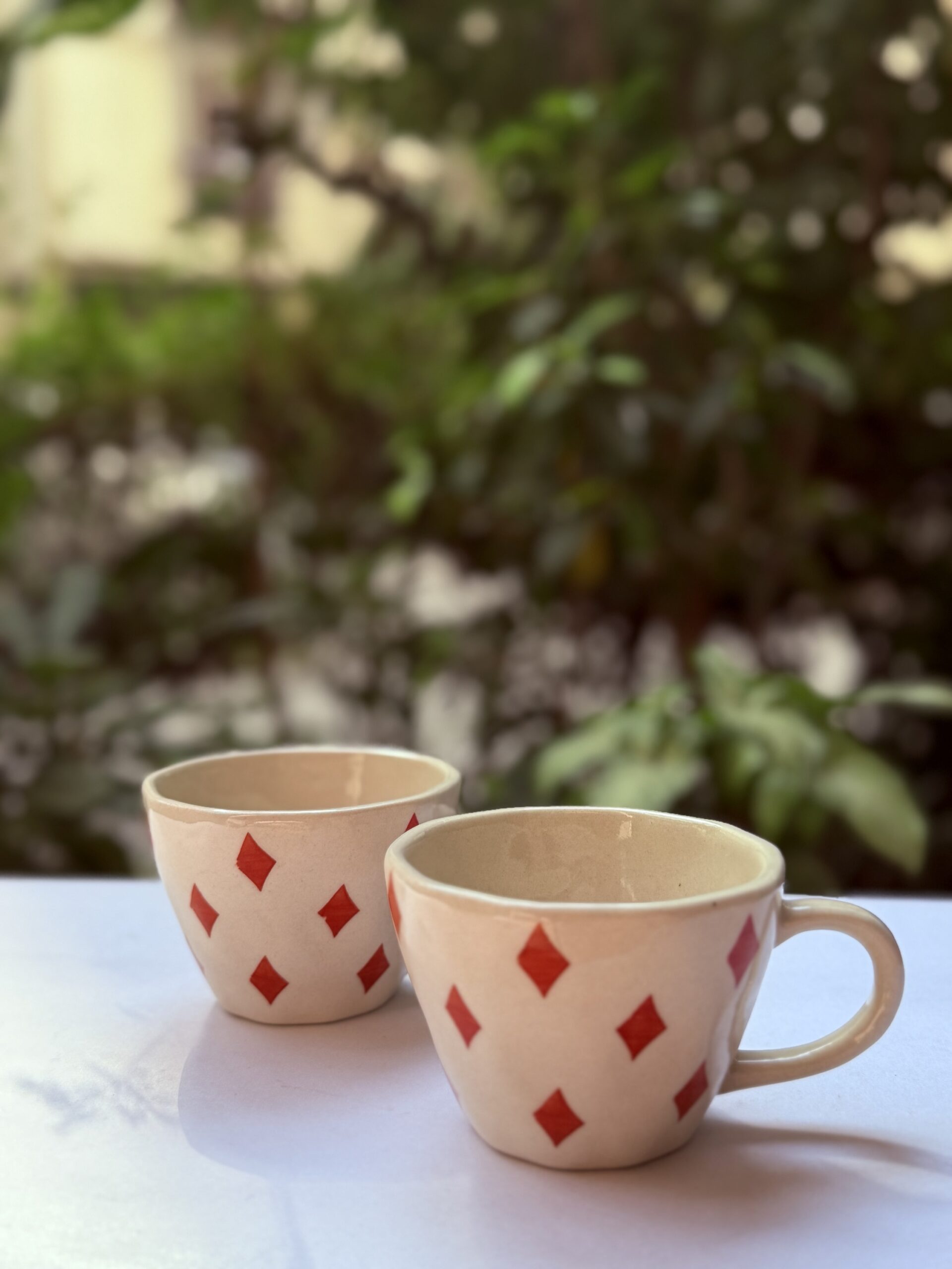 ( Inclusive of Tax )These hand painted ceramic mugs are a beautiful piece of art and adds a touch of elegance to your drink-ware collection. The red diamond design adds the perfect touch of love to your morning routine.